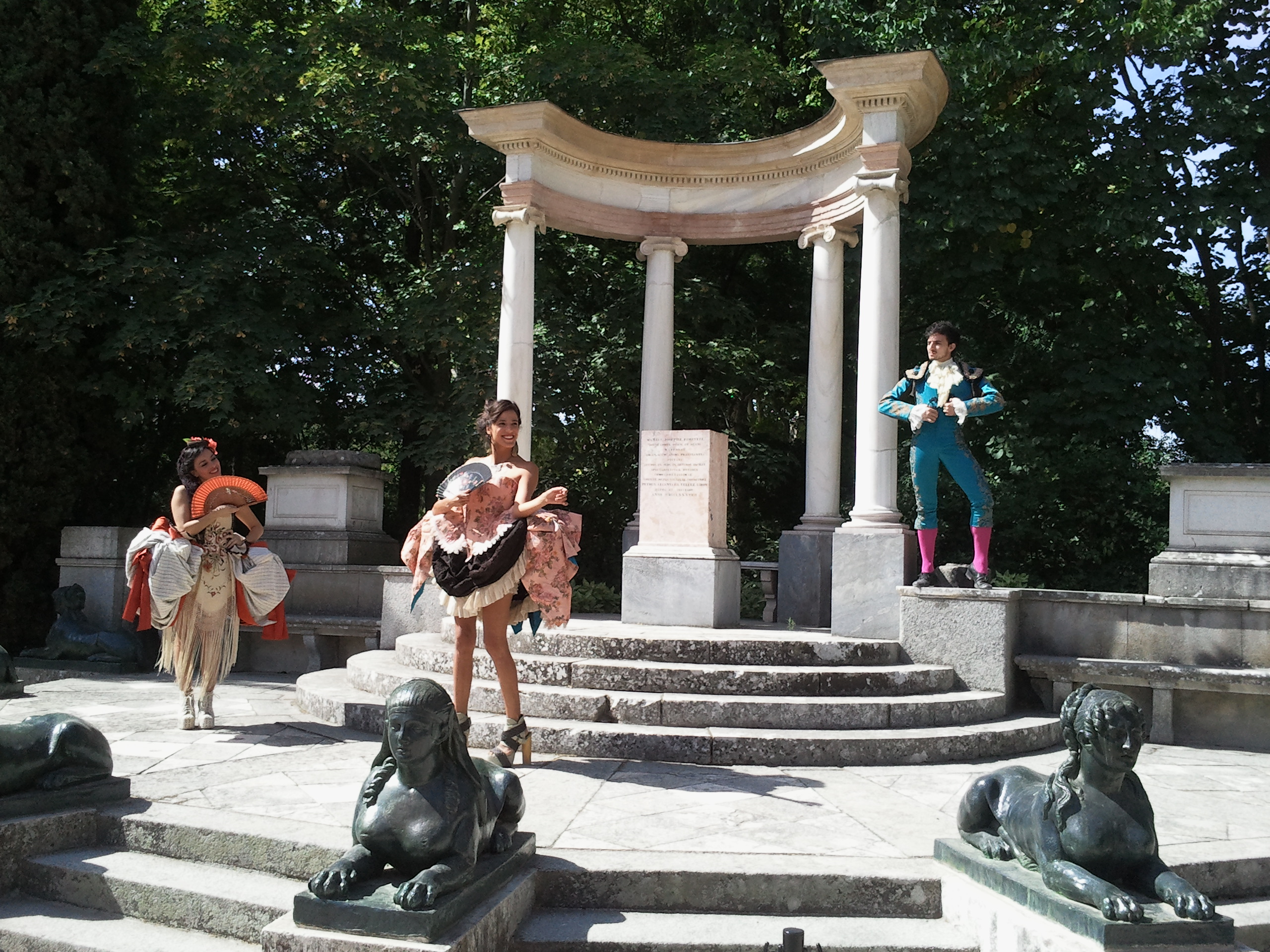 Un poco aterrorizados, y acompañados por sus gritos, podemos por fin seguir a la agradable y encantadora duquesa, llegando así a la amplia Plaza de los Emperadores. Aquí Paquita nos cuenta cómo los duques de Osuna eligieron este lugar para construir esta maravillosa finca de recreo y, sobre todo, su mágico jardín, obra de los mejores jardineros de la época. El relato, acompañado como siempre por las castañuelas del cautivador torero que nos mira desafiante desde lo alto de la Exedra rodeada de esfinges, concluye con un magnifico augurio: “Vivir la vida y vivirla amando…”.