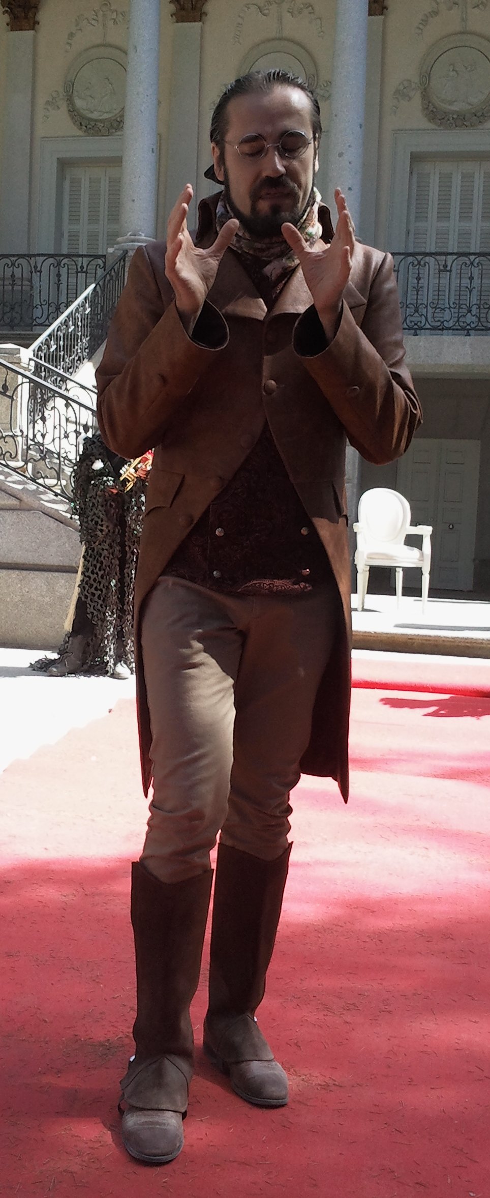 El célebre poeta sevillano, uno de los muchos literatos de los que se rodeaba la duquesa, se presenta como una auténtica alma en pena, atormentado por sus fantasmas -¿Lo somos nosotros? ¿Lo es él? ¿O lo es este mágico jardín?- y perseguido por los versos de otros famosos artistas de su época. Su actuación tragicómica es impresionante, admito que tengo debilidad por él, como también lo son sus salidas de escena: ¡Cuidado por donde pasa! Sin embargo, aunque se aleje a toda prisa, no lo perdáis de vista puesto que él siempre está allí, observando sin ser visto y, cuando menos lo esperáis, reaparece enloquecido abrazando a un árbol, imitando a un pájaro o corriendo con una sábana blanca…