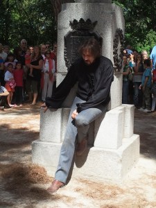 Pero pronto regresamos a la época dorada del jardín. Empujados por las frases sarcásticas del inquietante personaje del principio -¿Os acordáis de él? Seguimos sin saber quién es…- subimos por un pequeño sendero y llegamos jadeando a la Columna de Saturno. Allí aparece el personaje que, con sus tormentos y sus locuras, más simpatías y risas provoca entre grandes y pequeños: Gustavo Adolfo Bécquer.