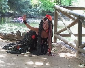 Con las suaves melodías literarias aún sonando en nuestra mente, y con Bécquer zascandileando a nuestras espaldas, nos dirigimos a la Casa de Cañas donde doña María Josefa de Pimentel y su amiga, concediendo un poco más de confianza a sus humildes invitados, se nos acercan susurrándonos con sus cálidas voces las tan conocidas rimas del don Juan Tenorio. Y se van… dejándonos, sobre todo al público masculino, embelesados y hechizados, quizás más por sus caricias que por sus palabras. Pero la magia de sus manos rozando suavemente nuestros rostros viene de repente interrumpida por la trágica y melodramática actuación de la Cuidadora del Parque. Al terminar su monólogo, cae un velo de tristeza entre los asistentes y se impone el silencio, roto solo por el fluir de la pequeña cascada del estanque. ¡Pero ánimo! ¡No se acaba todo aquí! “Alegrad esas caras, parece que os han subido…” Ya lo descubriréis vosotros mismos, prestando mucha atención a las palabras pronunciadas por la actriz a su despertar.
