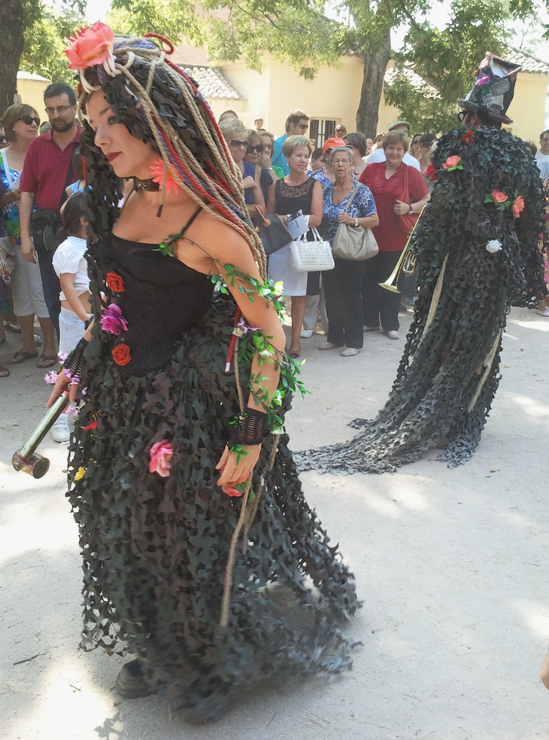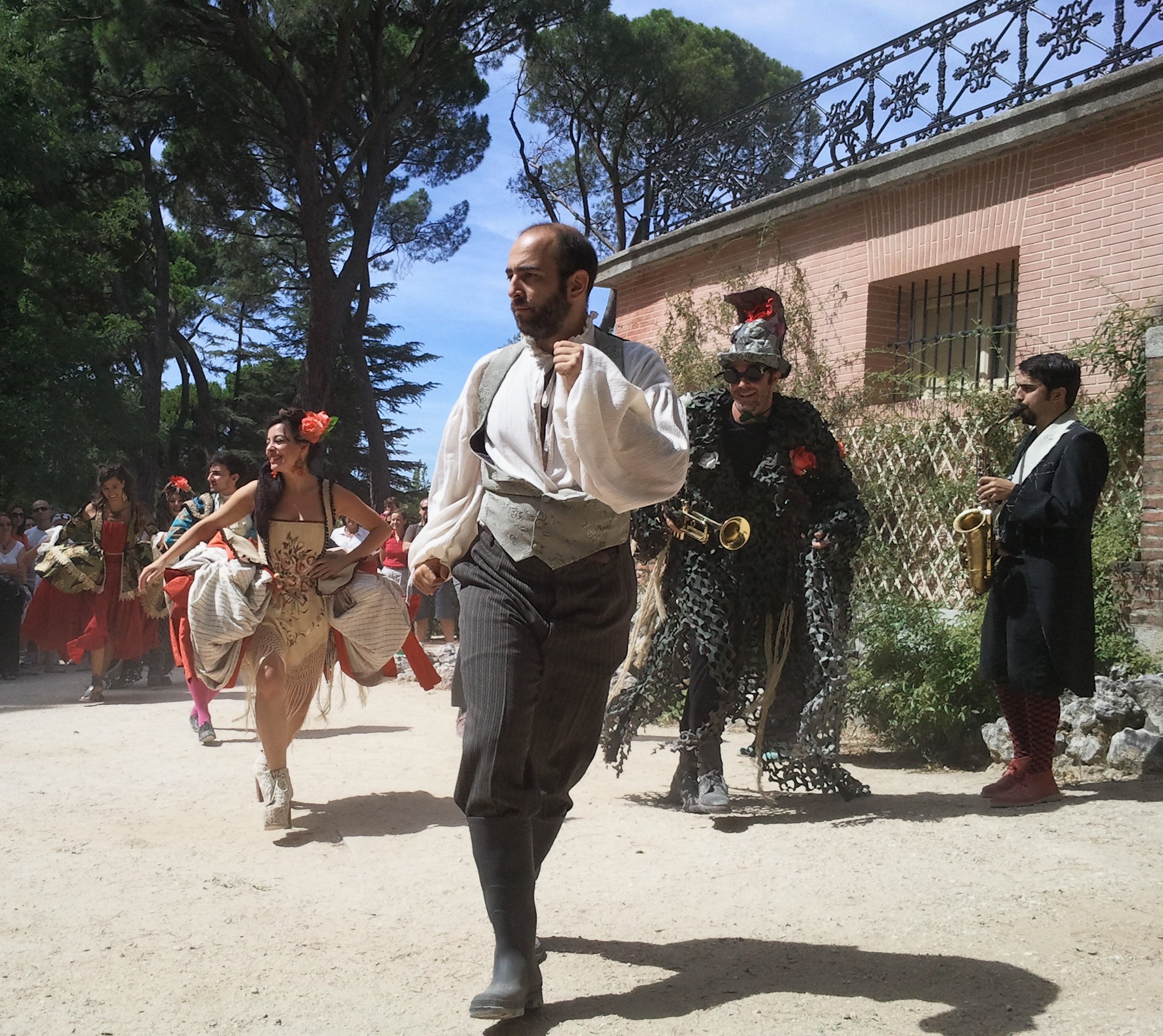 La ilustre dama por fin nos invita a acceder a sus aposentos, al jardín de sus sueños, y los asistentes la seguimos cautivados pero, de repente, un par de inquietantes personajes con unos vestidos estrafalarios y unas potentes voces nos cierran el paso, justo antes de la verja de entrada.