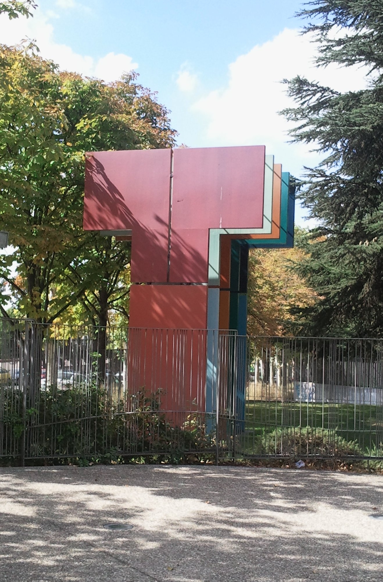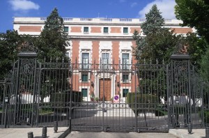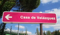 No sin cierta dificultad, llegamos a destino: los carteles son escasos y los que hay no se distinguen bien entre los demás de color violeta que indican las numerosas facultades, o colegios, de la Ciudad Universitaria. Por el camino, entre la vegetación que reina en esta parte de Madrid, descubrimos también una reluciente señal que despertó todas las alarmas, del tipo “planes”, “monumentos y palacios”, “visitas”, que siempre están en alerta dentro de mi cabeza: Casa de Velázquez. Confieso que nunca había oído hablar de esa casa que, por el fondo violeta de la inscripción callejera, tenía que ser algo digno de interés cultural.