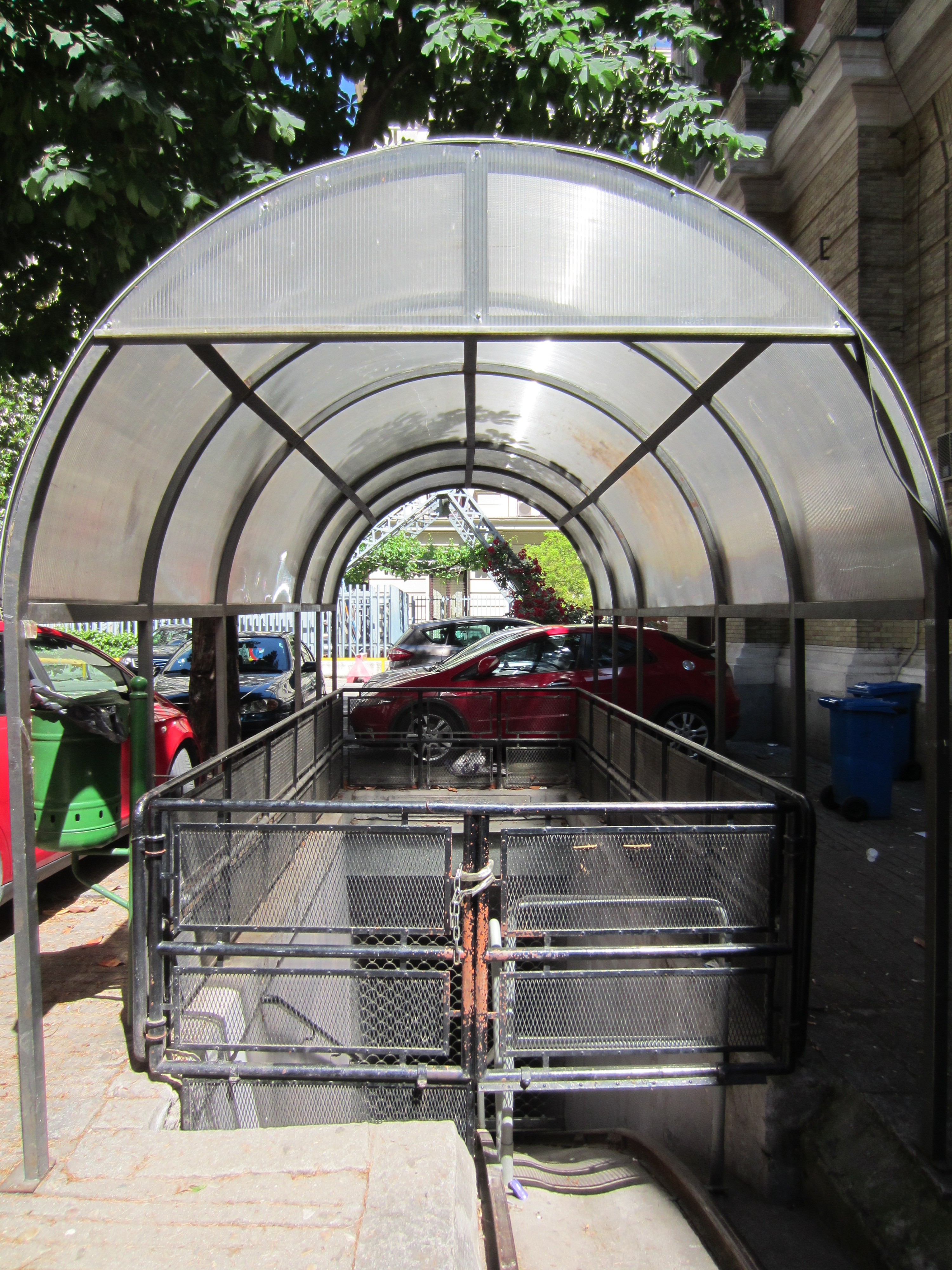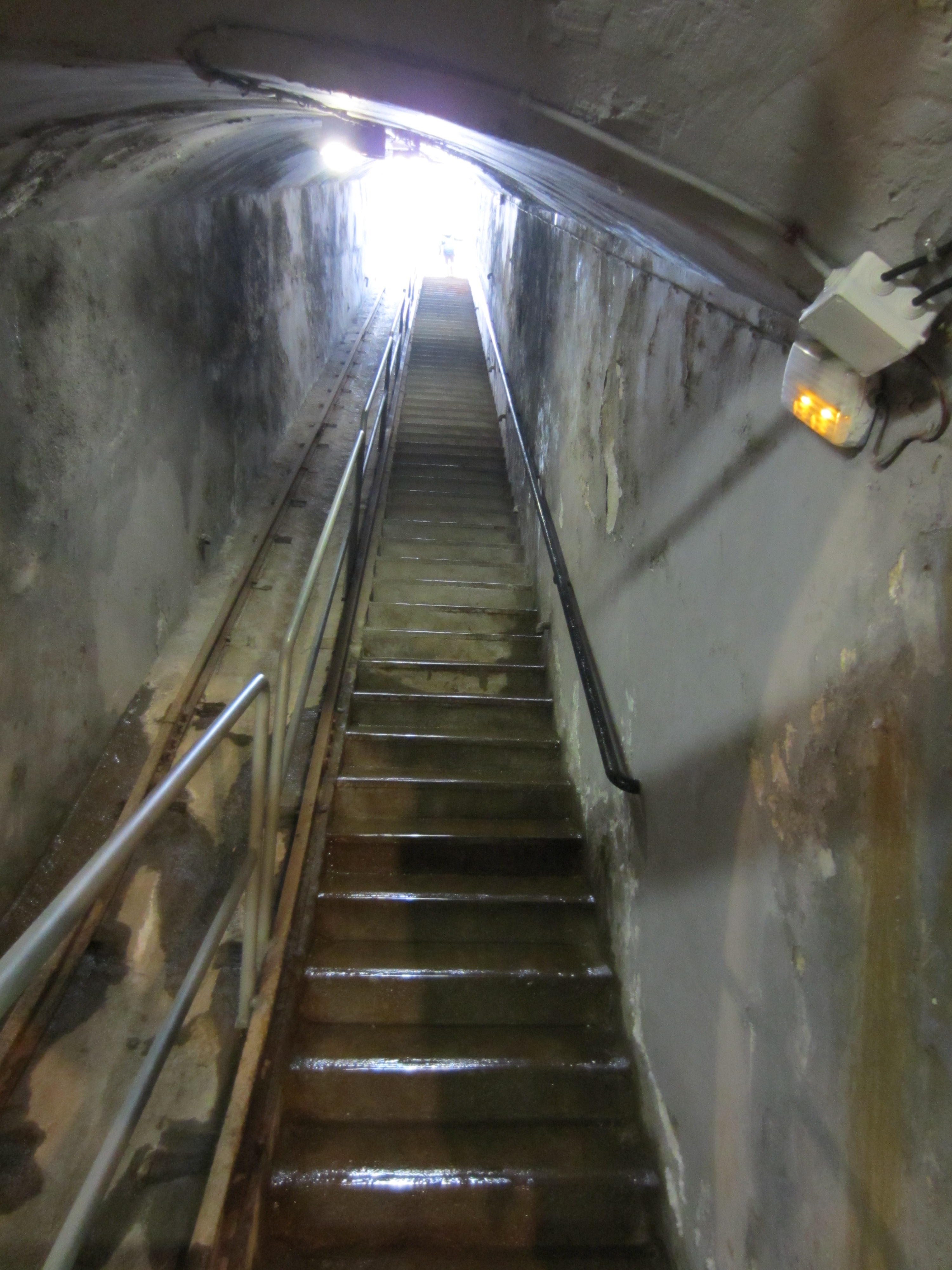 Después de unas oportunas, y reconfortantes, explicaciones, pudimos finalmente alcanzar nuestra deseada salida, la que daba al tranquilo patio exterior, y lo primero que llamó la atención de los más pequeños fue una enorme construcción vertical, parecida a un tan impresionante como tentador tobogán -en realidad, se trataba del castillete real del pozo “Mirador”- y, después, una evocadora y desgastada pelota de futbol que, inexplicablemente, había acabado en la esquina de un extraño lugar: estaba completamente vallado y bajo una cubierta transparente protegía una empinada escalera, flanqueada por una vía sobre un plano inclinado, que se perdía en una vertiginosa profundidad -con un poco de imaginación y mucha benevolencia, esa peculiar construcción parecía una humilde y sencilla versión madrileña de las artísticas bocas de metro bilbaínas de Norman Foster-.