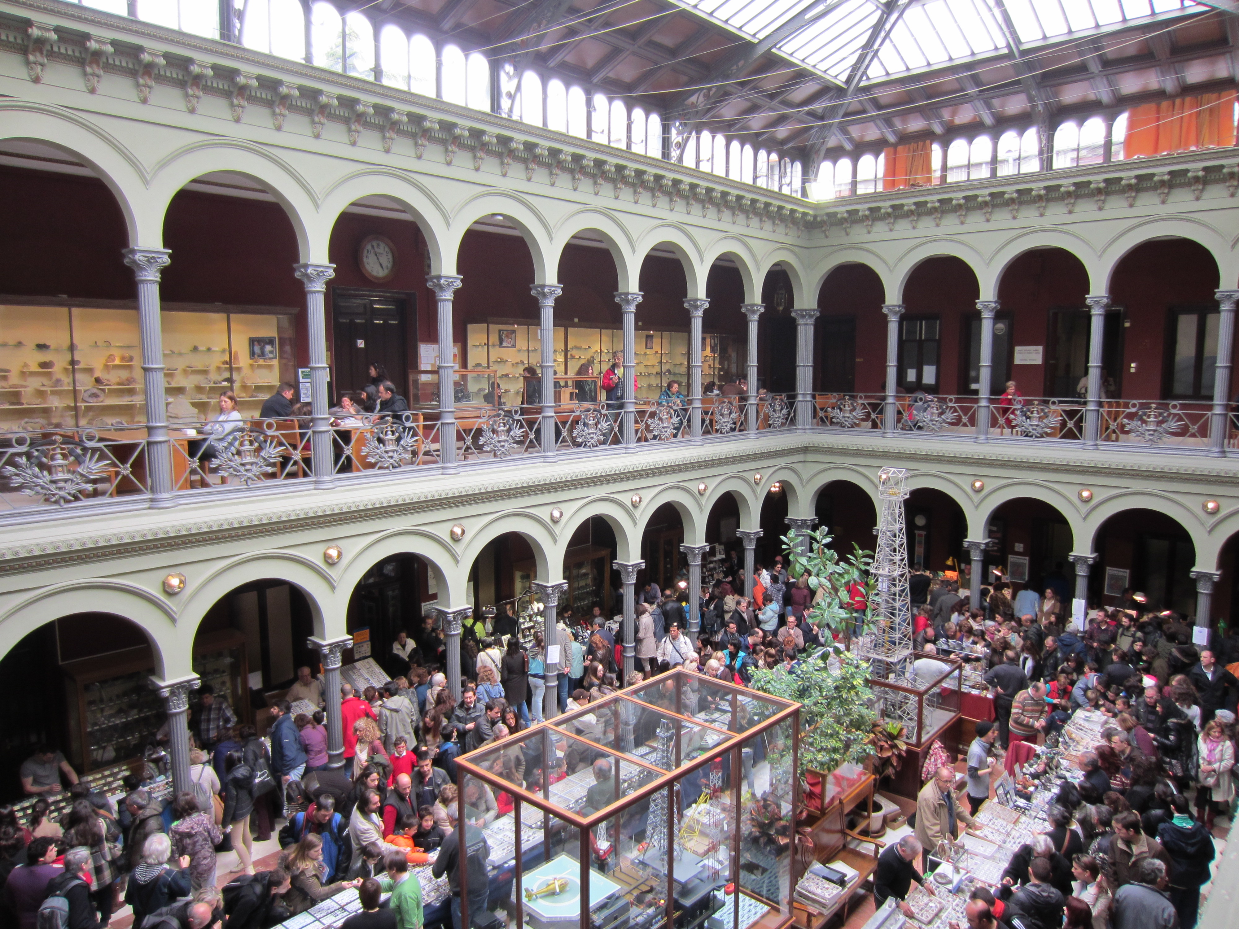 Una vez salimos de allí, deambulamos tranquilamente, en claro contraste con los frenéticos intercambios que se desarrollaban a nuestros piedi, por los pasillos de esa galería superior, amueblados con “grandes” pupitres de madera, en consonancia con la edad de sus habituales usuarios, y que servían, para la ocasión, como zonas de descanso de agotadas familias. Adosadas a las paredes había también unas cuantas vitrinas con diferentes clases de minerales, entre las cuales, empeñada como estaba en buscar una alternativa a “mi tesoro”, me llamó la atención una “celestina”: ¿Era esta una valiosa piedra mágica dotada de útiles, o peligrosos, poderes nupciales? Y, de ser así, ¿cómo podía apropiarme de ella?
