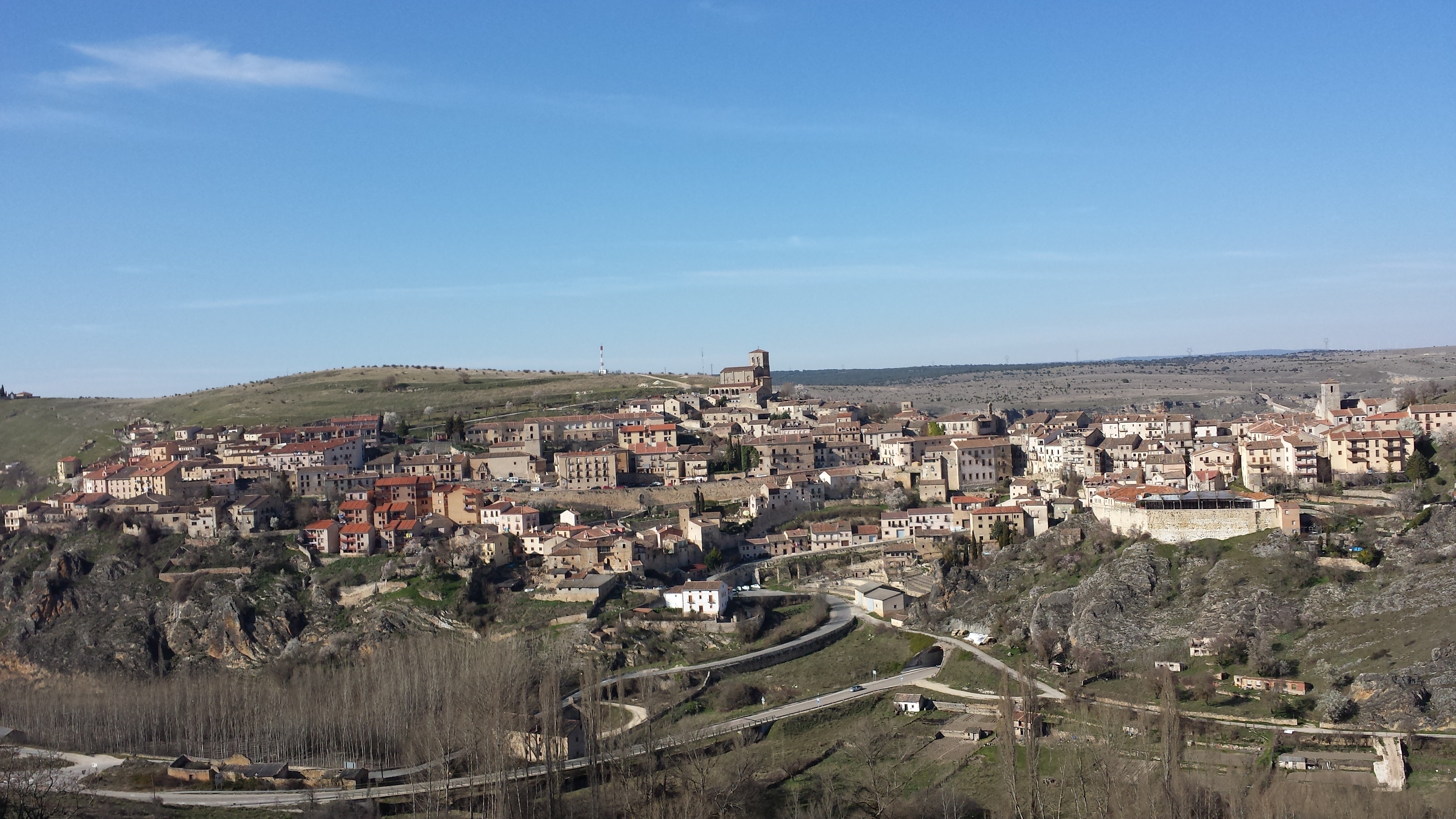 Pero, al igual que me ocurrió con Pedraza, ese magnífico panorama del pueblo segoviano asentado sobre una extensa peña tampoco me resultaba familiar. Detuvimos nuestro vehículo y estuvimos largo rato contemplando desde lejos las pintorescas y numerosas construcciones que componían lo que, en época medieval, había sido un enclave fundamental para la historia de Castilla y, después de haber retenido en nuestra mente y, esperaba yo, por lo menos esta vez, también en mi memoria, aquella soberbia imagen, seguimos por la carretera secundaria guiados por un desorientado, y por ende inútil, GPS, empeñado en llevarnos a otro lugar de igual denominación pero a mayor distancia. Nos encontrábamos en el medio de un paisaje casi lunar, sólo desmentido por la presencia de agua, la del río Caslilla. Afortunadamente la racionalidad humana, que en la actualidad va progresivamente dejando paso a la (casi) perfección y (casi) infalibilidad mecánica, supo imponerse y atendimos a nuestra lógica intuicción.
