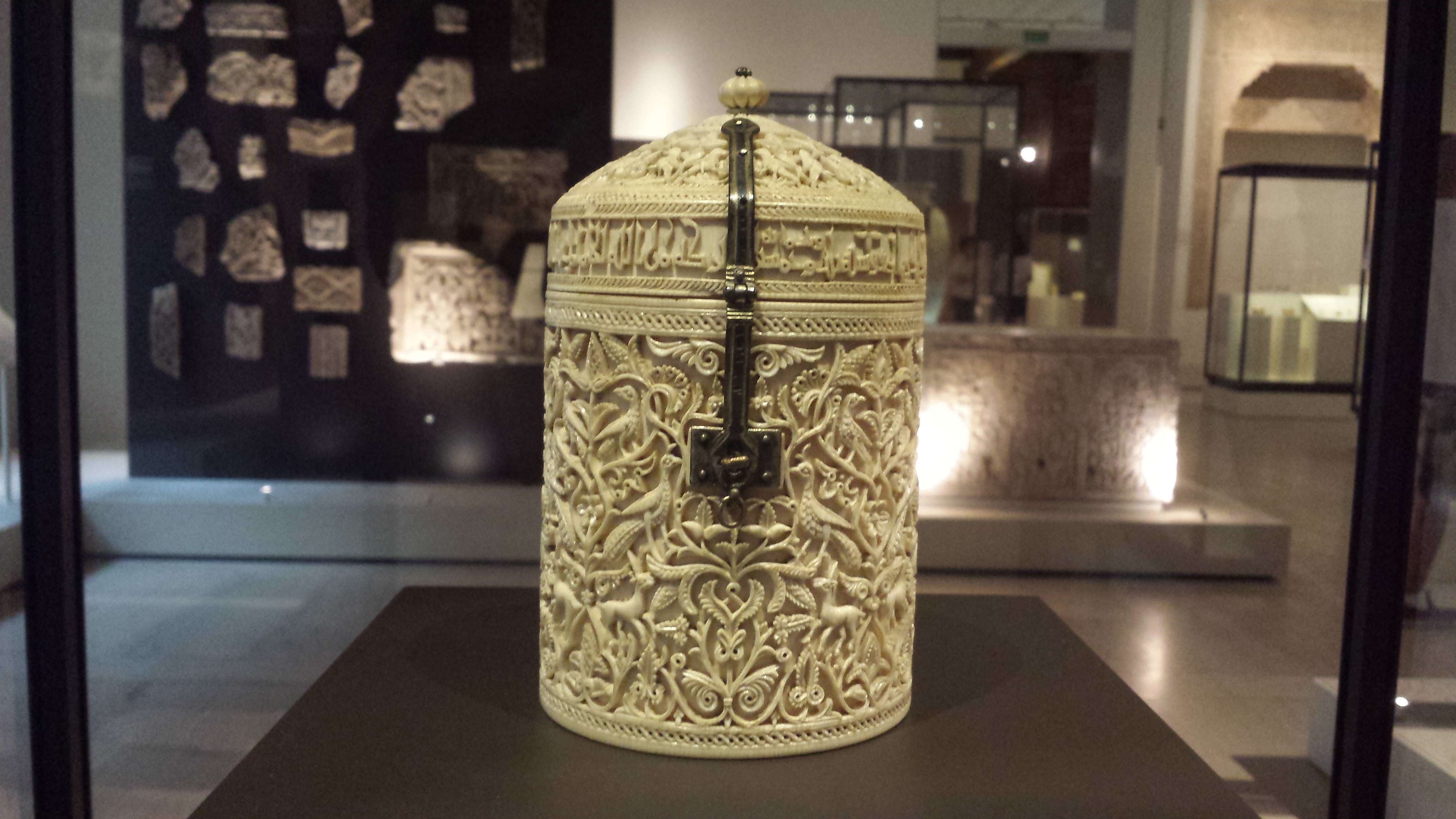 Así que, bajo una gran maqueta de la mezquita de Córdoba, y precedido por capiteles de diferentes facturas, montados sobre modernas columnas con función de soporte, como si de guardias gigantes se tratara, no pude evitar encontrarme con el famoso bote de Zamora, regalo de Al-Hakam II para su concubina Zoa, con su virtuosa decoración sobre marfil de pavos reales, gacelas y pájaros entre árboles, palmas, tallos, hojas, brotes y flores estilizadas.