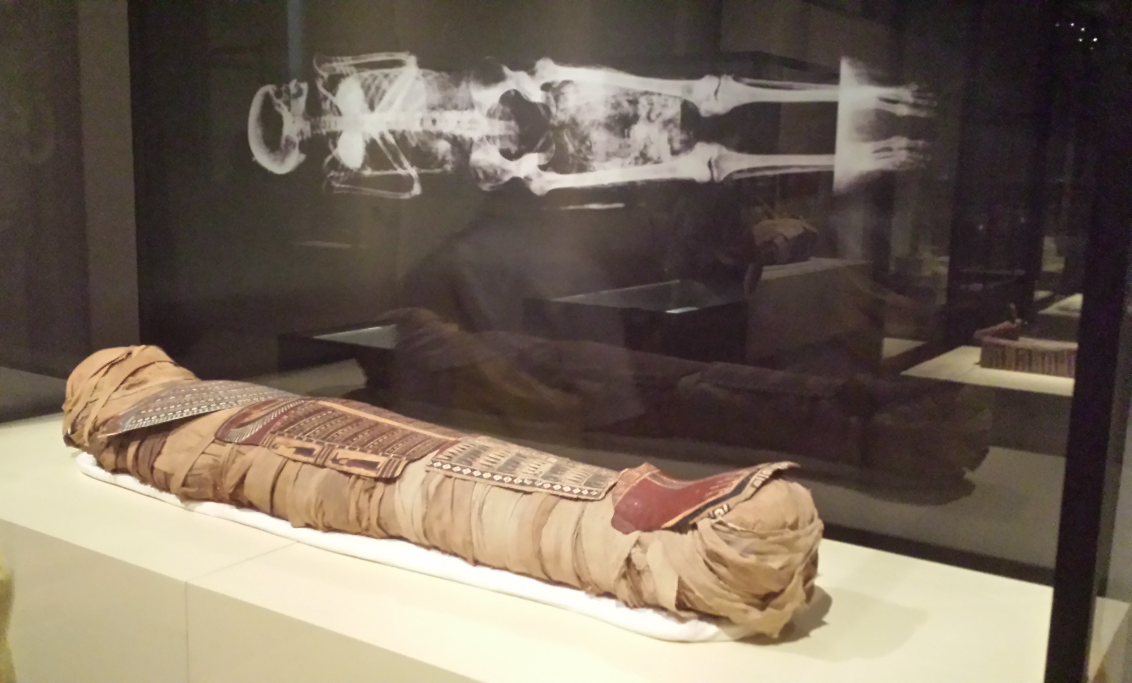 Me quedaba poco tiempo a disposición, apenas media hora antes de quedarme encerrada –después de todo no era mala idea, pensé– en ese sector del museo rodeada de enigmáticas estatuas de granito, como la de un anciano llamado Harsonmtusemhat, sacerdote, príncipe y escriba a la vez, y de basalto, como la de Nectanebo I, de ataúdes antropomorfos de madera policromada pertenecientes, entre otros, a sacerdotes de diferentes templos con esos nombres tan imposibles de pronunciar (Amenemhat o Ankhefenkhonsu), y de temibles momias, de mujeres y varones, cuya estructura ósea se reflejaba, como una radiografía, en el cristal de las vitrinas que la contenían –esas impactantes imágenes me recordaron la de la abrumadora y conmovedora Sábana Santa, expuesta en Turín con ocasión del Jubileo, cuya supuesta figura del cuerpo de Cristo se proyectaba en un panel encima de ella–.