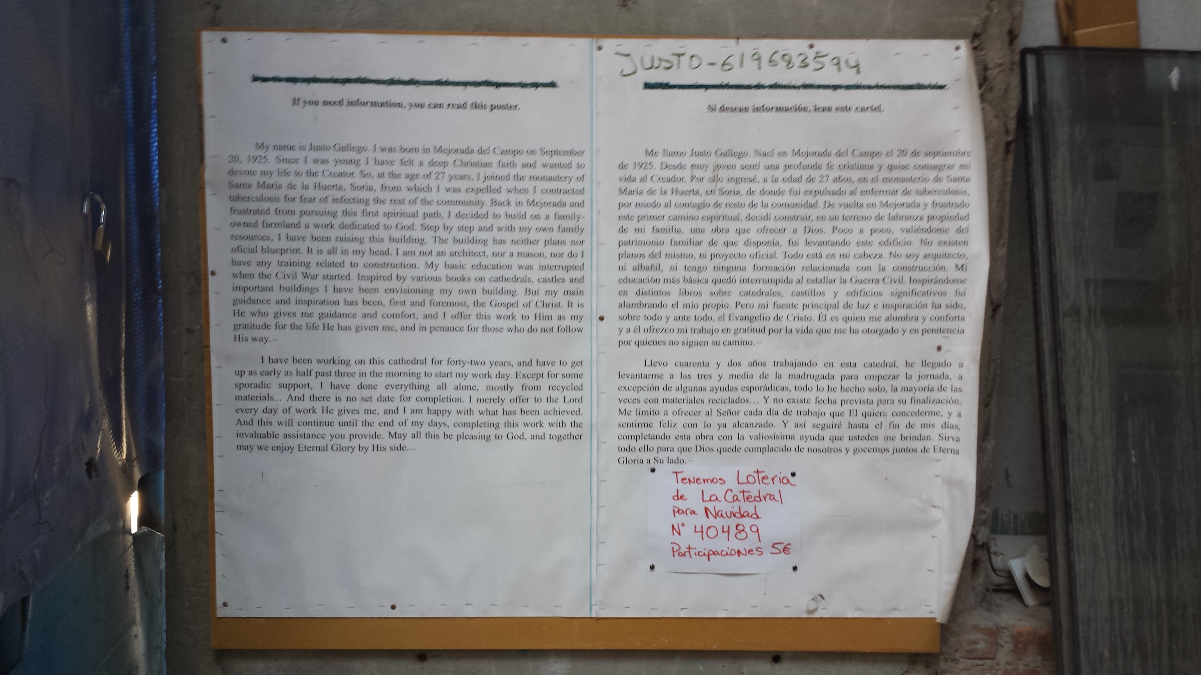 Como si fuera un reflejo inanimado de ese hombre, un cartel en la entrada, más bien un humilde papel, cubierto de polvo y arrugado por la humedad y los años, explicaba al visitante, en español ¡y en inglés!, la causa y el fin de todo aquello. Eran unas pocas líneas, directas y concisas, donde se relataba la historia de este san Francisco de Mejorada del Campo que, después de caer enfermo de tuberculosis y ser expulsado del monasterio en el que había ingresado por miedo al contagio del resto de la comunidad, una vez recuperada su salud, decidió, como agradecimiento al Señor, levantar una catedral en un terreno de labranza de propiedad familiar, disponiendo sólo de su patrimonio personal.