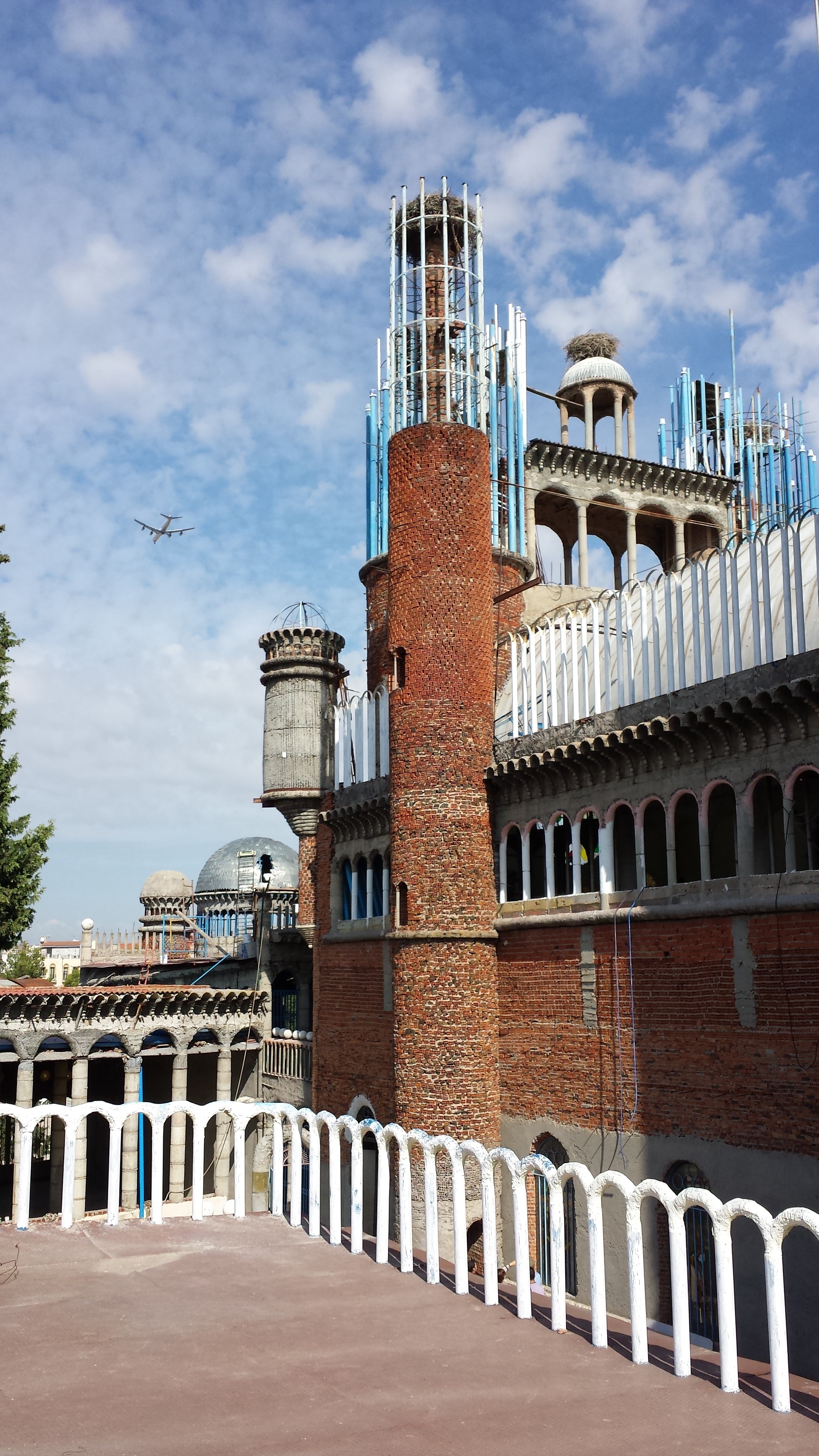 Estrechando, casi apretando, las manos de mis hijos para que no se alejaran de mí mientras que mi marido tomaba atrevidas fotos, pudimos contemplar los curiosos detalles de una cercana cúpula, también inacabada, una de las hermanas pequeñas de la principal, y de las altas torres de ladrillo “a vista” en forma de chimenea que se levantaban desafiantes en el aire y cuya cima se había convertido en el hogar de unas cuantas cigüeñas: esos nidos, cuales atípicos sombreros, se integraban armónicamente en la esperpéntica construcción…