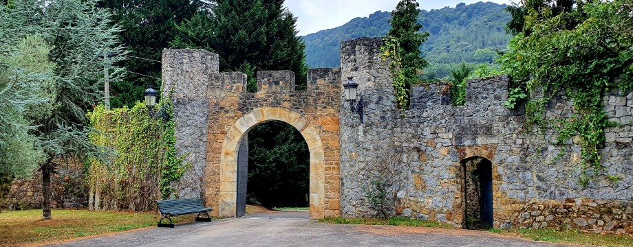 Conforme subíamos el txirimiri empezó a remitir y la mañana, gris pero no triste, fresca pero no fría, desnuda pero acogedora, intentó sin éxito enseñarnos algo del azul, de la luz y del sol que nos había deslumbrado en los anteriores días bilbaínos. Según el infalible Google Maps ya estábamos a punto de llegar, no obstante un par de leves errores de “co-pilotaje” por mi parte, pero más allá de la omnipresente vegetación que nos rodeaba, no aparecía nada más. Hasta que de repente, como por arte de magia, justo detrás de una curva pronunciada apareció un espeso muro de piedra y, a continuación, unas flechas de madera indicando los diferentes accesos a la Torre Loizaga.