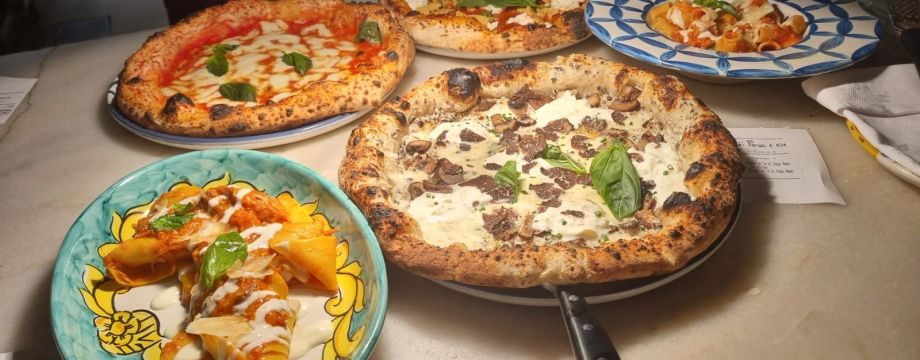 Las porciones, abundantes, ya nos estaban haciendo dudar sobre la posibilidad de terminar los platos de pasta que ya habíamos encargado –el pezzo forte de este restaurante junto con las afamadas pizzas que en más de una ocasión han ganado importantes premios, el último de ellos, en el 2023, el de “Mejor Pizza de la Comunidad de Madrid”, como se puede leer en el correspondiente certificado que, enmarcado, destaca orgulloso entre cuadros y platos colgados de cerámica partenopea – y, en efecto, todas nuestras dudas se confirmaron cuando en nuestra mesa se materializaron como por arte de magia, o, más probable, por arte de la appassionata squadra di pastai–pizzaioli, una maravillosa pasta alla carbonara, con pecorino romano y auténtico guanciale, como manda la tradición, y un cacio e tartufo servido escenográfica y directamente en la rueda de queso pecorino.