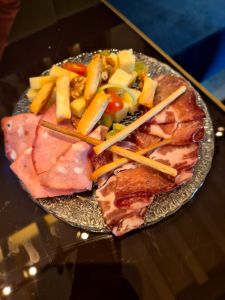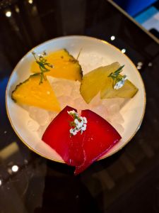 Durante el mismo, venciendo mi resistencia típicamente italiana a no compartir nunca la comida sino a disfrutarla siempre de forma individual, con un plato dodo para mí, probamos una selección de quesos, entre los que identifiqué claramente un buen parmiggiano reggiano, y diferentes embutidos, acompañados por uvas, nueces, picos y grissini italianos, y una refrescante y saludable “fruta a la fruta”, compuesta por melón, piña y sandia, enriquecidos con suaves toques de zumos naturales.