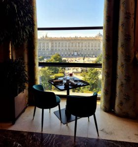 La decoración y la arquitectura, por supuesto, fueron lo primero que me impactó: techos altos de cortinas infinitas, escenográficas plantas colgantes como si se tratara de unos jardines de Babilonia, cómodos sofás de líneas curvas e llamativos colores turquesa y esmeralda, una barra reluciente de exóticas reminiscencias -o, al menos, a mí me produjo esa sensación–, una luz artificial que, discreta y suave, se sumaba a la natural que entraba de los enormes ventanales y, tras estos, una soberbias e incomparables vistas a la fachada este del Palacio Real y de la, más reciente, y menos armoniosa, Catedral de la Almudena (v. foto de la portada).