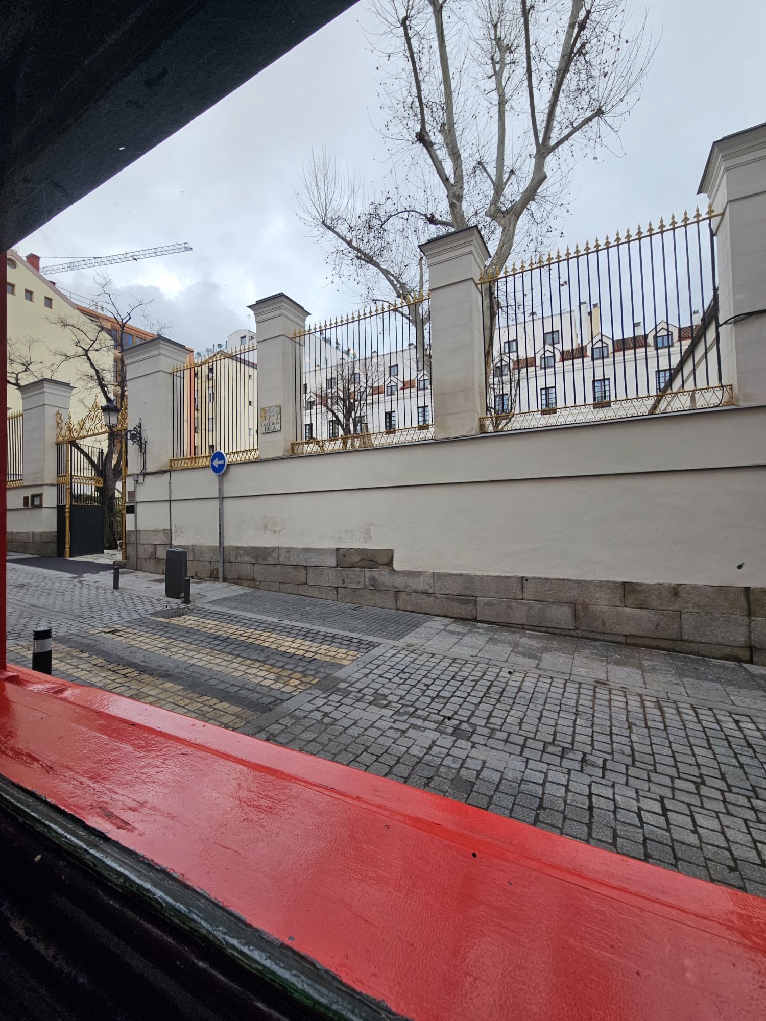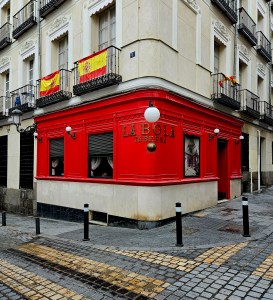 Ubicada en la homónima calle, en el cruce con la de Guillermo Rolland, esta taberna tan castiza, fundada sin embargo en 1870 por una emprendedora asturiana, con su llamativa fachada de color rojo, decorada con puertas y ventanas de madera y curiosas lámparas exteriores en forma de bola –¡menuda casualidad!–, impone su pequeña, pero gran presencia, gastronómica y también arquitectónica, frente al cual se sitúan, a un lado, al austero y severo edificio, similar a un monasterio, que aloja actualmente la Escuela Superior de Conservación y Restauración de Bienes Culturales, y, al otro, un palacio isabelino reconvertido recientemente en un impresionante hotel de lujo.